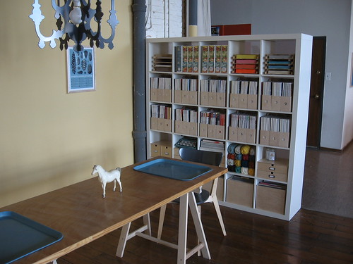 My husband has been wanting to put up a bookshelf much like the expedit in our place to divide it up. However, I’m having a hard time following his logic since he’s all about open spaces. Oxymoron anyone?