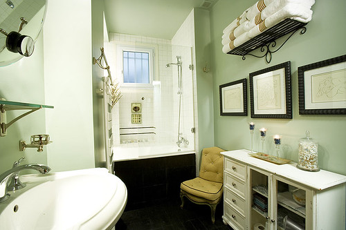 my bathroom is pretty white right now…apart from one bright shower curtain. I'd like to bring in a mix of accessories or furniture as shown here.