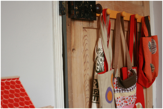 From an artist's "sneak peak" into her home. She designed the bags. I have a similar look at home with some $2.50 over-the-door hooks from Target's dollar section. My pantry now holds all my cloth bags that are used to tote groceries and library books around town.