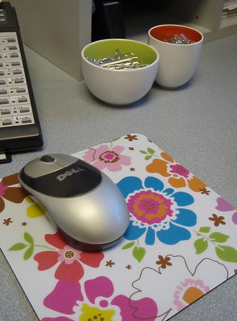 Added some color to my office this week with the cute mousepad. Really brings out the color in the paper clip holder/dishes from IKEA.