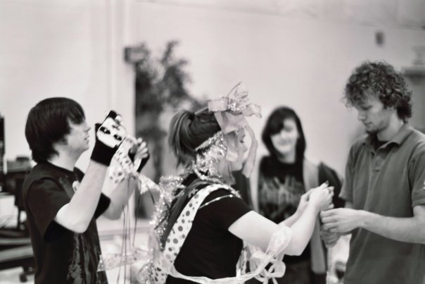 We had to unwrap the giftwrapped boxes before painting them but took a break to wrap Katie up in the ribbons as if she were a Christmas tree.  Rather, she was a Christmas faerie.