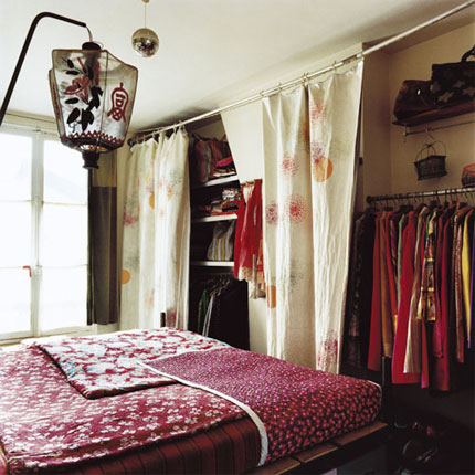 The bedding colors are striking and the organized closet with the pretty curtains – love it!