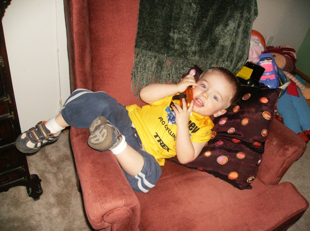 Hudson got bored with "coloring" and "taking photos" so he wandered over to a comfy chair and began chatting on the "phone" (toy phone).  He looks so relaxed that I wonder if he'll be a teen that talks on the phone for hours and hours?  Speaking of teens and phones…