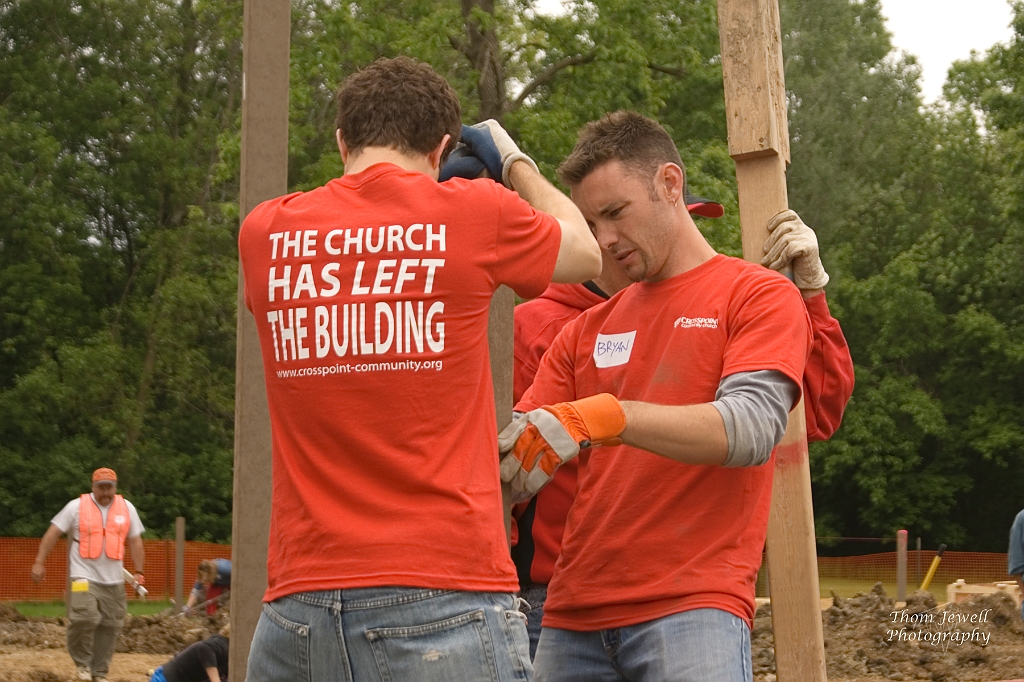 The man on the left (in the red shirt..not the man in the construction vest) is the outreach pastor – Mac. On his right, wearing the nametag stating "Bryan" is Youth Guy (Bryan Roe). I'll find a better photo of him for you.