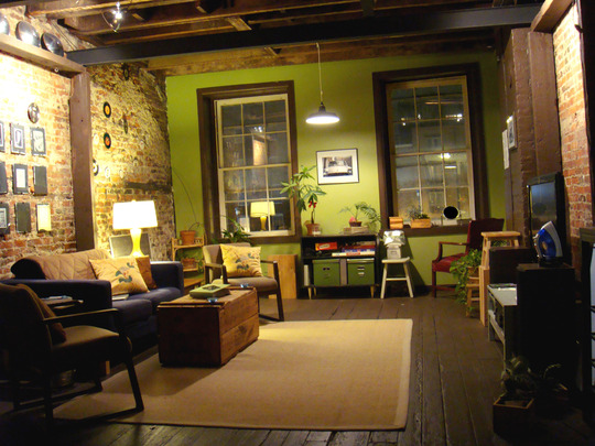 What a pretty studio – with the exposed brick, the happy green walls..and the simple layout.