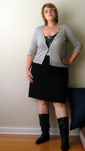I like the navy sweater (?) coat, the grey, the tights and the boots.