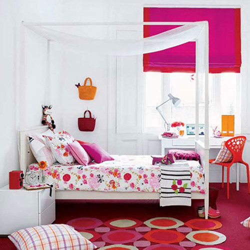 Wait. I think I want this bedroom right now! The bedding, rug and window covering would lead to sweet dreams indeed!