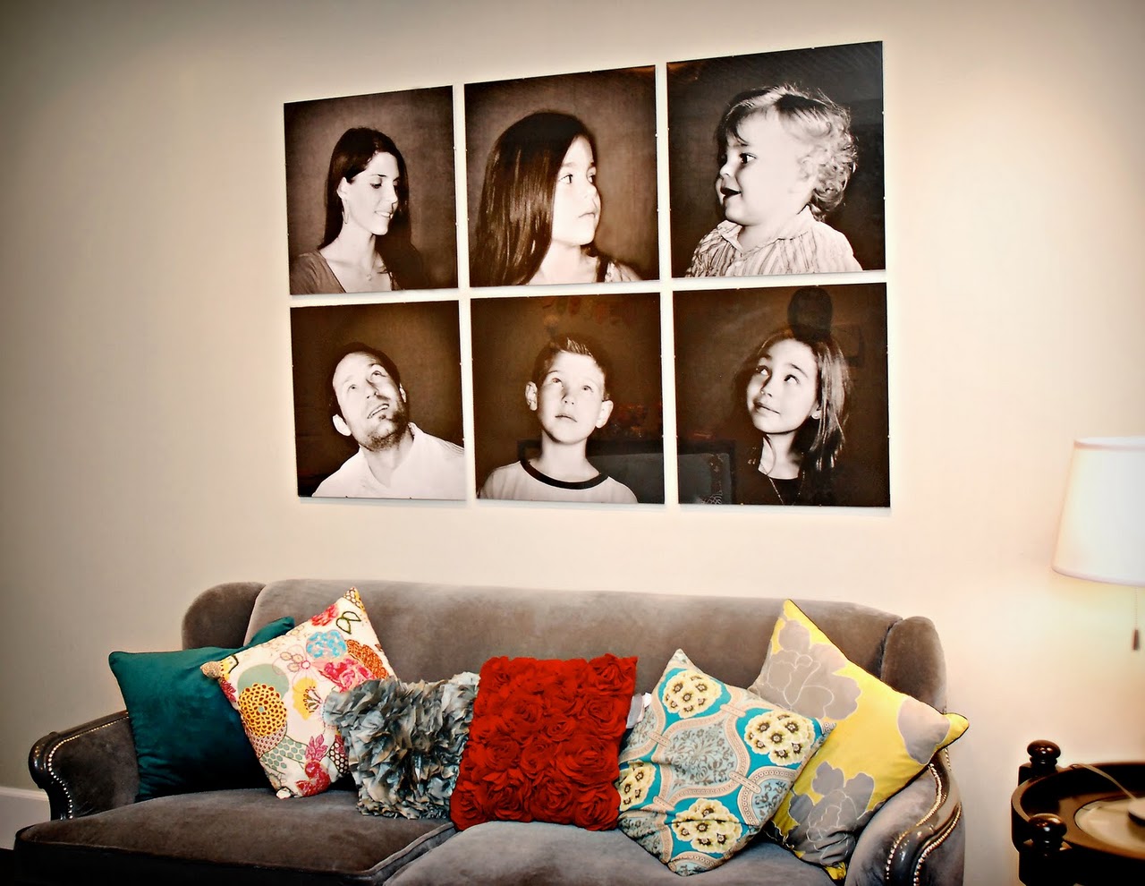 What a great idea! And check out the couch and pillows below the portrait (if you can tear your eyes away from the brady bunch wall!) Jennie (of Focus Jennie) got the couch for fifty dollars on Craigslist (and fixed it up to her liking).
