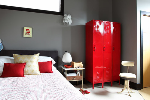 I shall pretend this afternoon that this is my own bedroom looking all stylish and pretty and that in the glossy red lockers are stowed some secrets and a pared down wardrobe. Oh look, I left some beautiful red shoes behind.