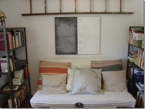 Loving the colors, the ladder on the wall, the print and chalkboard above the couch.