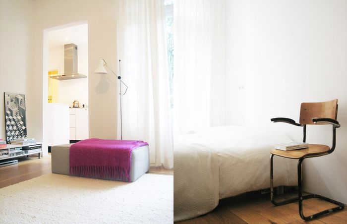 Jonna Klumpenaar's apartment is what I wish my apartment could be. Realized this weekend that if there is a blank wall, I will put things against it (artwork, baskets, furniture..anything)….and if there's a bare counter or table, I will put just enough items on it to fill it from one end to the other in a line. Guess who is hesitant to have white space in her home???