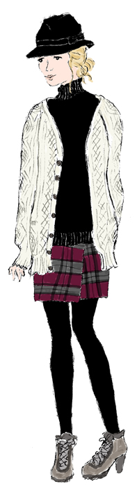 I'm a fan of the orange-fabric-covered cushion + the stack of books on a desk corner + the simple, chic outfit in the drawing. May the chicness from these images flow into your life π