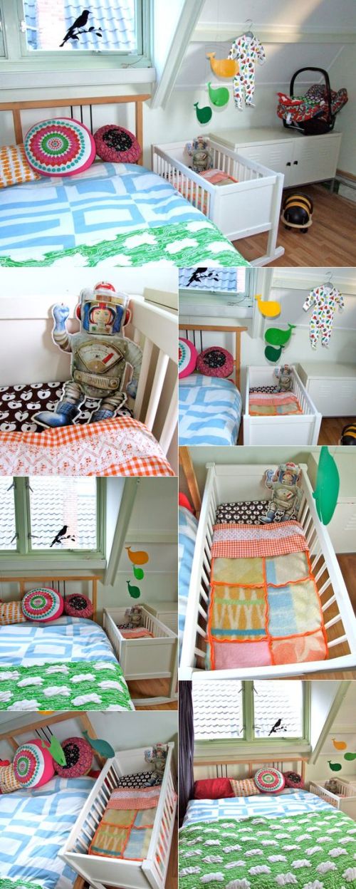 Isn't the bed and the crib cozy looking? I haven't been sleeping well lately so these photos make me want to crawl right into them and curl up under that green blanket and take a long nap.