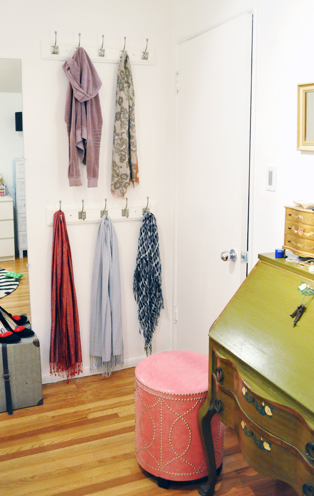 I then stumble upon this pretty blog where the author has just redone a corner of her bedroom to include two hook fixturs to tidy up her hoodies and scarves. (note: I kept staring at the photo, wondering what the cute little room was around the half-wall when I realized I was staring at the reflection of the bedroom in a mirror. nice.)