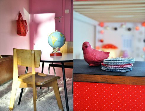 At so-deco, a daughter requested a loft bed for her room. Her mom explained her thoughts here, "At first, I found imposing. We must rethink everything, instead of the dresser, toys …Enjoy the space under the bed to make it a cozy little corner. Not to mention my madness for sweet vintage!!"