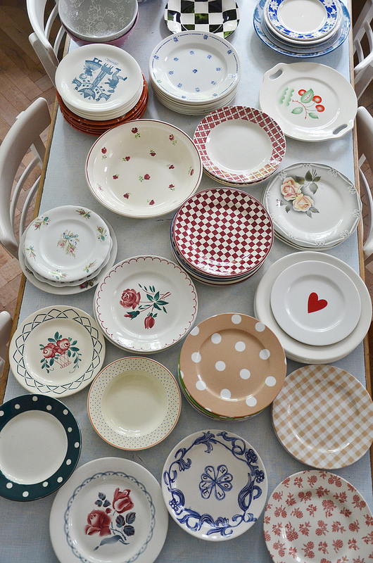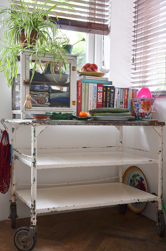 I've long been a fan of Ingrid Jansen's style and work. I'm particularly smitten with her kitchen these days. She took a plan cabinet door and turned it into the cutest pinboard. Then she organized her beautiful dishes on an antique serving cart. Beautiful.